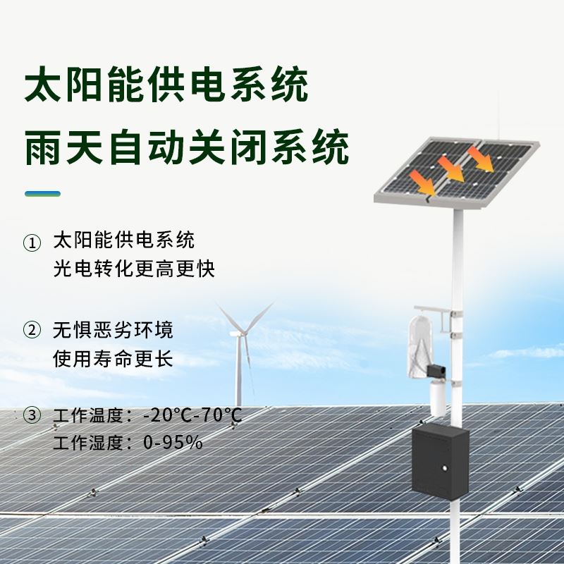 1、系统采用太阳能供电系统,并实现雨天自动关闭系统运行;主机须能在恶劣气象长期正常工作,工作温度:-20℃-70℃;工作湿度:0-95%