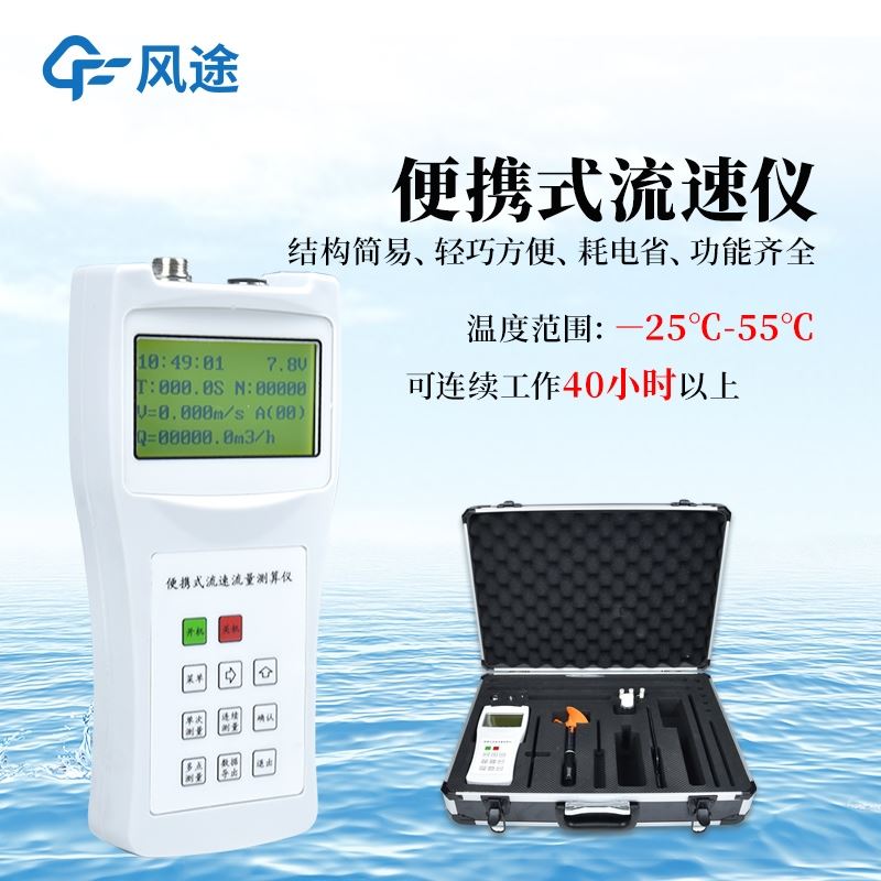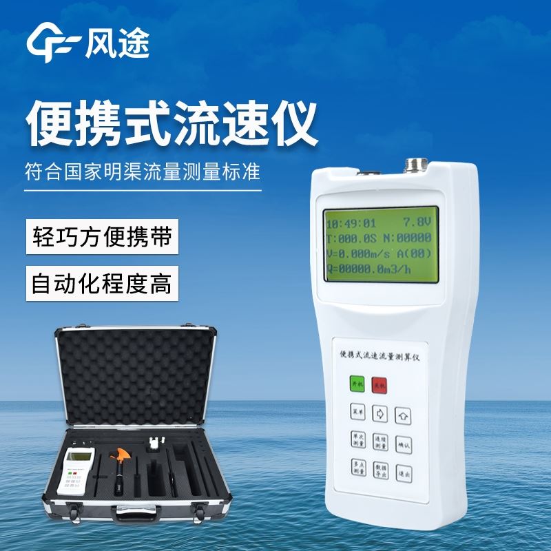 便携式流速仪主要由LS1206B型旋桨式流速传感器、流速测算仪、0.4m×4Ф16测杆组成。全套仪器置于高级铝合金密码箱内。接通信号线,即可进行各明渠中流速的测量,并自动显示流速。